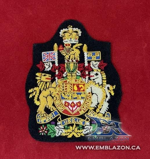 This badge is made from the highest quality melton wool fabric that is hand stitched using the finest gold bullion wire and silk threads. This is the smaller 3/4 size of original Canadian Coat of Arms.