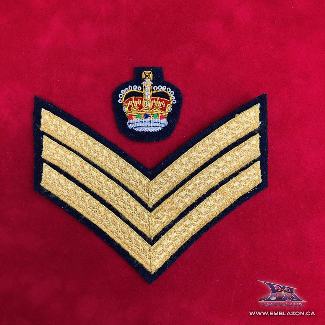 This chevron badge is made from the highest quality melton wool fabric that is hand stitched using the finest gold bullion braid, bullion wire and silk threads for the crown.