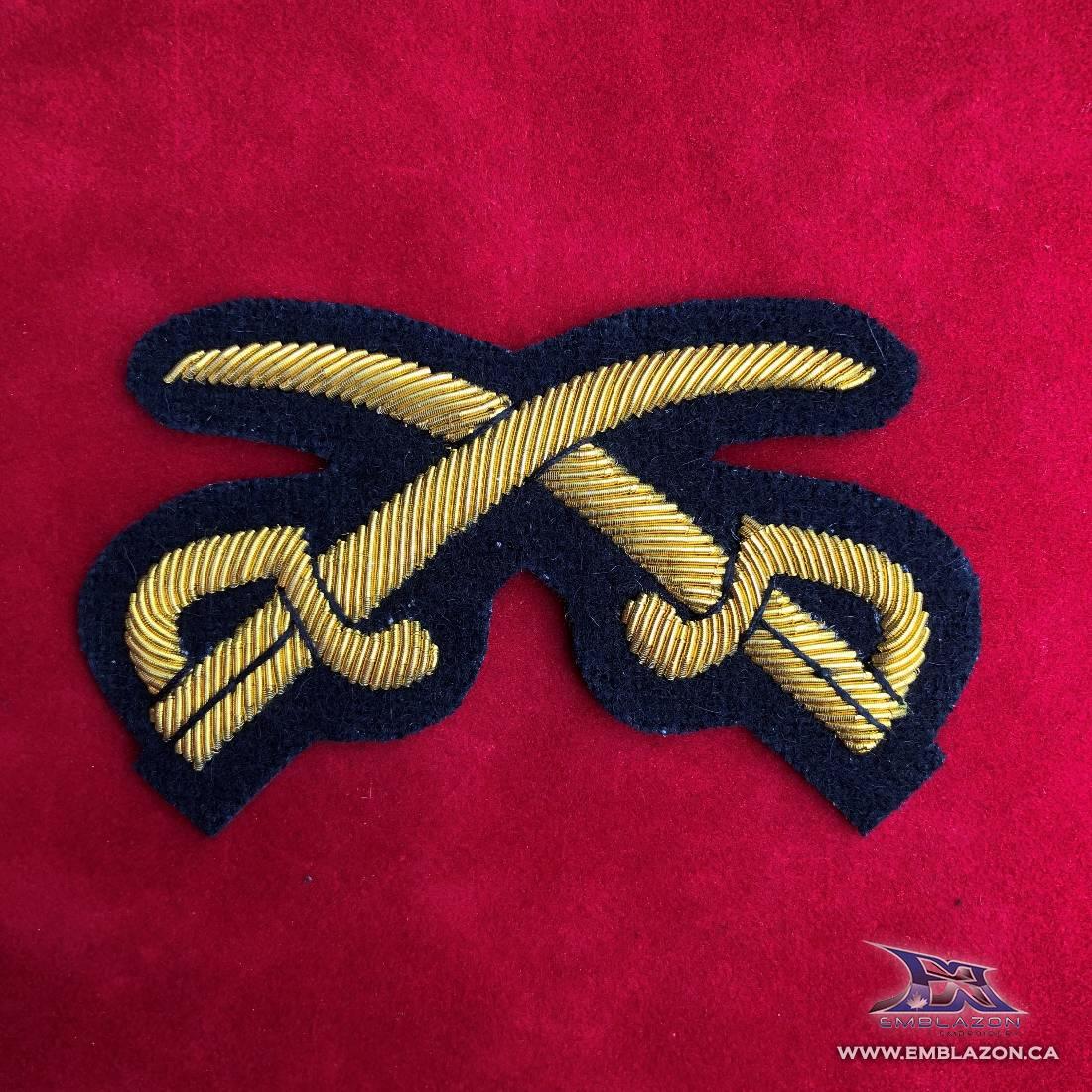 Crossed Sabers This badge is made from the highest quality melton wool fabric that is hand stitched using the finest gold bullion thread. Size – 2” (51 mm) Tall x 3 ¼” (83 mm) Wide Also available on red melton wool