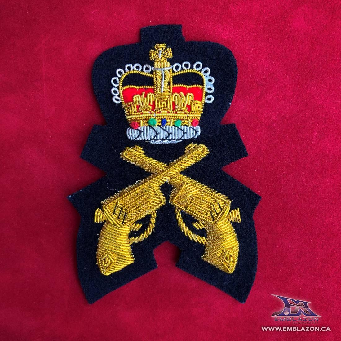 Crossed Revolvers with Crown This badge is made from the highest quality melton wool fabric that is hand stitched using the finest gold bullion wire. This badge reflects the issue size of the Force issue badge that is worn on the Red Serge by RCMP members as well as other Provincial and Federal Agencies. Size – 2 ½” (64 mm) Wide x 3 ¼” (83 mm) Tall. Also available in gold on red and silver on blue.