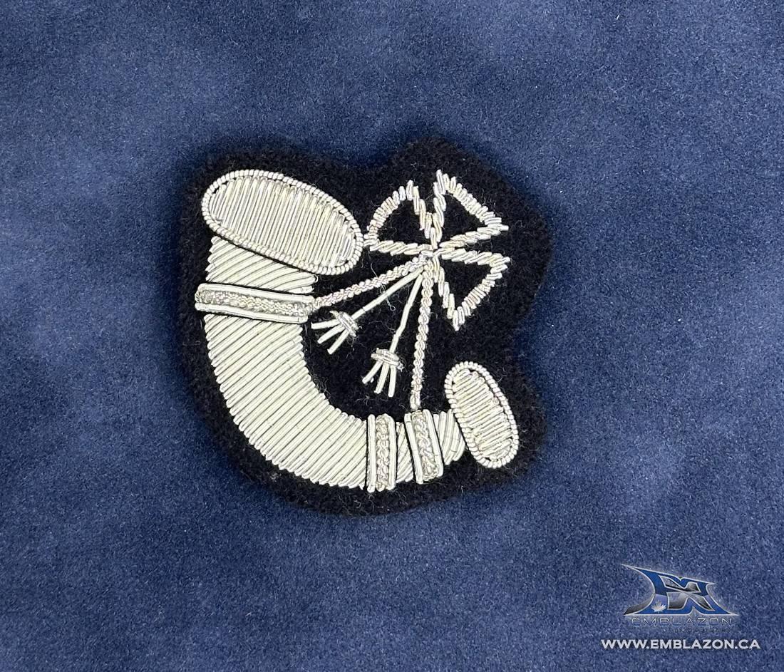 Bugler This Bugler appointment badge is made from the highest quality melton wool fabric that is hand stitched using the finest gold bullion wire. This badge reflects the issue size of the Force issue badge that is worn on the Red Surge by RCMP members. Size – 2” (50 mm) Tall.